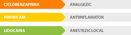 1 gram gel contine piroxicam 5 mg, lidocaina 20 mg, ciclobenzaprina clorhidrat 5 mg.